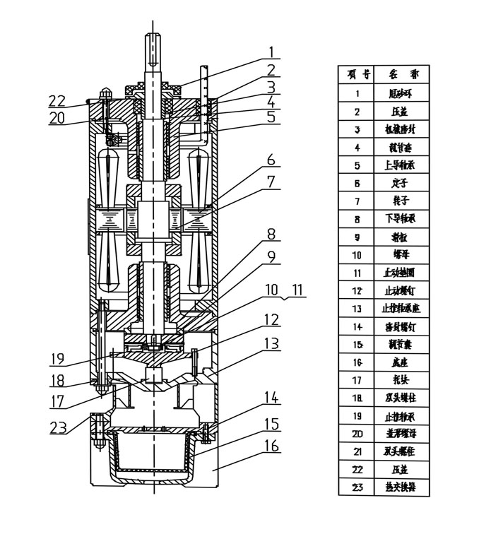 注:高推力型軸承需特殊訂貨,采用高推力型軸承的電機性能由用戶與制造廠協(xié)議。適用條件 1、電動機應完全潛入水中立式(或臥式適用),其潛入深度不大于70m,最低位置距海底不少于5m。 2、介質(zhì)水溫不高于30℃。 3、水中固體雜質(zhì)含量(重量比)不超過0.5%。 4、介質(zhì)水中不含腐蝕性物質(zhì),PH值在7.9-8.6范圍內(nèi)。 5、電機運行時內(nèi)部應充滿潔凈的清水(可加防凍液)。 6、功率范圍: 11.2kw—180kw(2級轉(zhuǎn)速) 33kw---620kw(4級轉(zhuǎn)速) 適用場合:水井 6”、8” 、10”、12”、16” 或水池、水坑中。 設備特點 ★ 電機防護等級:IPX8,絕緣等級為F; ★ 采用德國引進技術(shù),具有結(jié)構(gòu)簡單、運行可靠、使用壽命長、維修方便、力能指標高等優(yōu)點 ★ YQSH系列井用潛水三項異步電動機為濕式充水密封性結(jié)構(gòu) ★ 不銹鋼304材質(zhì)(特殊材質(zhì)316、316L、3861錫青銅須定制) ★ 耐腐蝕,硬度大 ★ 電動機運行性能穩(wěn)定噪音極小 ★ 用戶需要時可以臥式使用(但壽命是立式的60%) 海水潛水電機結(jié)構(gòu) 1、 潛水電機由定子、轉(zhuǎn)子、上下導軸承、下連接法蘭、底座、軸伸密封裝置等組成。 2、 潛水電機各止口連接處采用密封圈密封;軸伸密封根據(jù)水質(zhì)含砂量多少,選擇不同方式的密封裝置。(含砂量大于0.01%時采用橡膠骨架油封;含砂量大于0.01-0.5%時采用機械密封) 3、 電動機下部裝有橡膠調(diào)節(jié)囊,其作用為當電機內(nèi)部熱脹冷縮時及電機外部水位高低變化時,用以平衡電機內(nèi)腔與水的壓力。 4、 電動機定子繞組采用耐水絕緣線,有良好的絕緣能力,繞組線與耐水JHS型電纜連接。 5、 潛水電機上、下導軸承座內(nèi)裝有軸瓦,轉(zhuǎn)子下部裝有止推軸承。止推軸承由上、下止推軸承及滑板組成,用于承擔軸向力。 技術(shù)支持 1、保證電機的引出電纜處端電壓為380(1±5%)V,頻率為50(1±1%)HZ同步轉(zhuǎn)速3000r/min。 YQSHD系列潛水電動機工作的額定電壓為460,三相交流為60HZ,同步轉(zhuǎn)速3600r/min。 2、電機的******運行電流不得大于銘牌上的標定值(即額定電流,配套廠家和用戶在選用和調(diào)試潛水電泵機組的電源控制設備時,應特別注意); 3、電機應選用合適的控制方式(可實現(xiàn)電機的過載、欠壓、斷相運行的保護并可根據(jù)水位自動控制電泵的起停); 4、電機為連續(xù)工作制(S1)。兩次起動時間間隔不得小于10分鐘; 5、電機應可豎直使用,也可臥式使用(須特殊訂制); 6、用于水池或超過規(guī)定的井徑中時應加裝散熱器,使電機表面的水流速度達到0.5-1m/s,以保證電機良好的散熱。散熱器應將電動機和第一,二級泵包括在內(nèi)。 注:當環(huán)境水或電網(wǎng)電壓、頻率不符合上述規(guī)定時,用戶可以提出要求,本公司提供訂制適用產(chǎn)品。