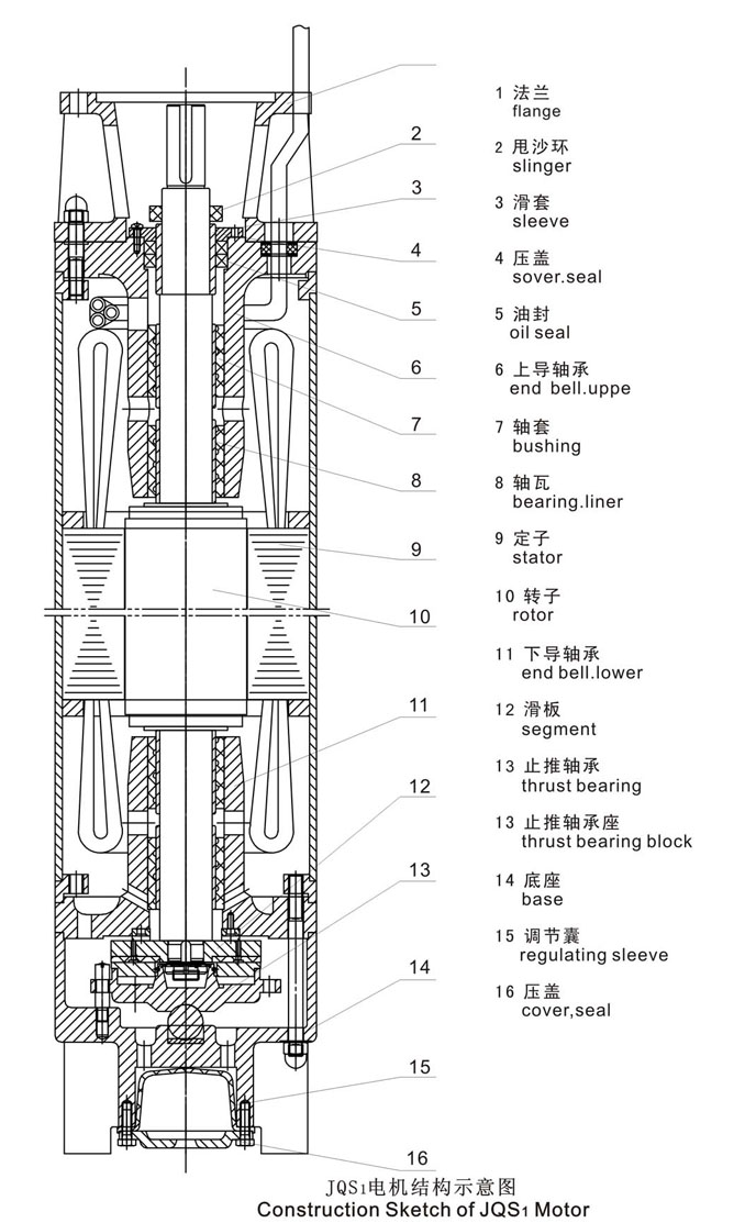 JQS 系列井用潛水三相異步電動機為濕式充水密封型機構(gòu),主要用于8’’、 10’’深井中驅(qū)動潛水泵提取地下水,為城市、工礦企業(yè)、農(nóng)田灌溉、牧場和居民生活提供生產(chǎn)和生活用水。JQS 1 系列電機設(shè)計合理,并經(jīng)多年生產(chǎn)實踐經(jīng)驗屢加改進(jìn),具有機構(gòu)簡單、噪音小、性能優(yōu)良、使用可靠、維修方便、運用于水中、節(jié)約基礎(chǔ)投資等特點。